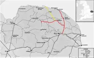The East Norfolk Railway Act 1864 (27 & 28 Vict. c. cxxii) included plans for a line to Aylsham, diverging south of Wroxham station. In 1876 this plan was revived, and modified, to leave the main line north of Wroxham station.[6] The branch line diverged on a tight 10 chain curve at Wroxham Junction.[7] A large granary was provided at Aylsham, stables were provided at Coltishall for the malt trade and a local man paid for a large shed at Buxton.[8] The Great Eastern Railway had taken control of the East Norfolk Railway in 1881, before this line was completed.[9] The branch joined the Great Eastern Railway's line from Dereham to Fakenham at Broom Green, where there was a 20 chain curve.[7] The complete line opened in 1882.[10]