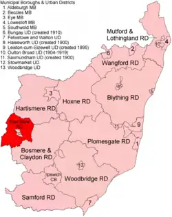 It was abolished in 1934 under a County Review Order. Its area went to form part of Gipping Rural District, with a small part being transferred to Stowmarket urban district.[1] In 1974 the area became part of Mid Suffolk district.