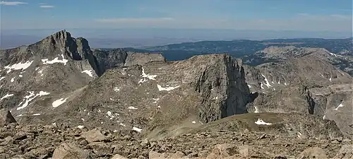 East Temple Peak (exact height range is somewhere between 12,605 to 12,645 feet (3,842 to 3,854 m)[1]) is located in the southern Wind River Range in the U.S. state of Wyoming. East Temple Peak is a little over 1 mile (1.6 km) northeast of Temple Peak and 1.5 mi (2.4 km) west of Wind River Peak.[3] A small glacier clings to the northeast slopes of East Temple Peak. East Temple Peak is in the Bridger Wilderness of Bridger-Teton National Forest.