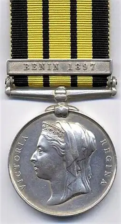 Awards of the medal covered punitive expeditions against local tribesmen, generally in response to attacks against Europeans or neighbouring tribes, or for operations to suppress slavery. Most medals were granted to personnel from either the Royal Navy, the West India Regiment or British led local forces, including locally recruited police. No units of the British Army were present, although a number of officers and non commissioned officers received the medal while seconded to local units.[2] Recipients of the Benin 1897 clasp included three nursing sisters.[3]