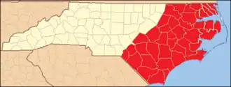 Eastern North Carolina generally consists of 41 counties, which when combined form a total regional area of roughly 9,700 square miles (25000 square km). The counties commonly included in the region are as follows:[5]