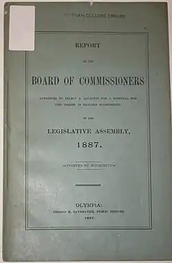 In 1887, following a territorial legislative session in Olympia, Thomas H. Cavanaugh and Secretary Charles W. Clarke issued their summary report, the Report of the Board of Commissioners Appointed to Select a Location for A Hospital for the Insane in Eastern Washington to the Legislative Assembly. The report details the search and evaluation for a site to construct an insane asylum in eastern Washington State by the Board of Commissioners and how Medical Lake was the preferred location. The report is addressed to the Council and House of Representatives of the Territory of Washington.