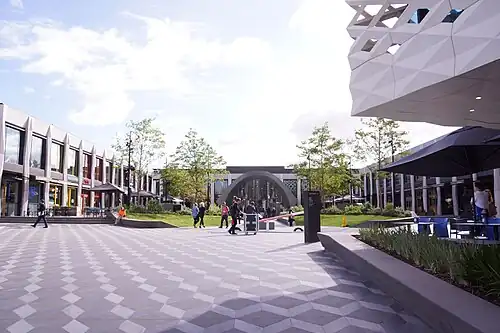 QIC publicly unveiled the plans on 28 October 2013. The $665 million redevelopment expanded retail space from 80,000 to 113,000 m2 (860,000 to 1,220,000 sq ft) and included construction of an additional three storeys connecting the southern end of the centre with the Maroondah Highway.[19] This included a new entrance to the third level of Myer, an outdoor public square with food and beverage outlets and a new public library. Office and hotel towers were also proposed adjacent to the new precinct together with a Target and David Jones department stores.[20][21][22]