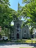 1876 | Gothic revival brick church with tower and spire in the middle of the front facade. Large stained glass window above entrance. Interior has stamped tin ceilings and wainscotting.[38] |