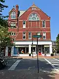 1879 | Independent Order of Odd Fellows built this lodge in 1879 after an earlier lodge burnt down. Distinctive four-story brick building with irregular roof line. Washington Street facade has a small tower-like gable, topped by a finial, that contains the interior stairway. Large decorative windows are centered on the fourth floor of a larger gable, and each window contains stained glass patterned with symbols of the fraternal order.[47] |