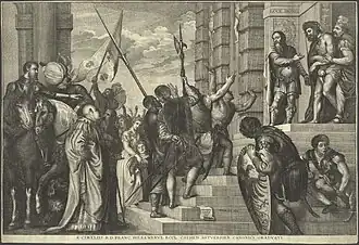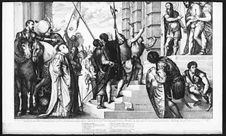 The Ecce Homo Titian finished in the year 1543 for Giovanni d'Anna, a rich Dutch or Flemish merchant settled in Venice, whom Vasari calls "Titian's compare"('gossip').[2] It was still in the possession of the merchant family in 1580.[3] It was rumoured that King Henry III of France had in vain offered to Paolo d'Anna the sum of 800 ducats for the famous Ecce Homo in 1574.[4] It was purchased by Sir Henry Wotton in the early seventeenth century to pass into the hands of the Duke of Buckingham in 1621, who refused £7,000 for it, offered by the Earl of Arundel. The picture left England under the Commonwealth.[5] It was auctioned at Antwerp in 1648, and later acquired by Archduke Leopold Wilhelm for his brother Emperor Ferdinand III in Prague.[1] Mentioned various times as preserved in Prague, it was transferred to Vienna in 1723.[3]