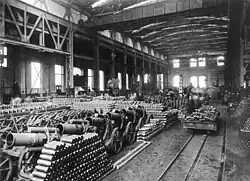 Despite fears in 1915-16 that munitions production was lagging, in the longer term the output was more than adequate. The annual output of artillery grew from 91 guns in 1914 to 8039 in 1918. Warplanes soared from 200 in 1914 to 3200 in 1918, while the production of machine guns went from 300 to 121,000.[7] Early failures in munitions manufacturing led to full British government intervention in war production. These controls helped its industry produce nearly 4 million rifles, 250,000 machine guns, 52,000 aeroplanes, 2,800 tanks, 25,000 artillery pieces and over 170 million rounds of artillery shells by 1918.[8]
