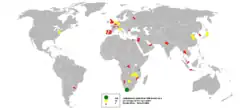 In 2000, Zimbabwe launched a controversial land reform that, over the next decade, would seize about 6,000 large, white-owned farms and convert them into over 168,000 black-owned farms.[24][25] Many of the new occupants, mainly consisting of landless black citizens and several prominent members of the ruling ZANU-PF administration, were inexperienced or uninterested in farming, thereby failing to retain the labour-intensive, highly efficient management of previous landowners, triggering severe export losses.[26][27]