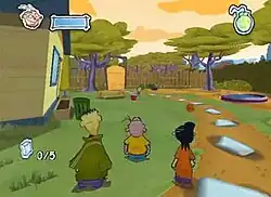 Ed, Edd n Eddy: The Mis-Edventures is a 3D platforming game in which protagonists Ed, Edd, and Eddy are playable characters. Players can use them in special tag team formations like the "(Leaning-)Tower-of-Eddy" (as Eddy), "Trampol-Edd" (as Edd aka Double D), and "Batter-Ed(-Ram)" (as Ed) to complete eight levels, referred to as scams. The Eds' normal weapons and skills include Ed lifting heavy objects and smashing his head, Edd using a slingshot to hit distant targets and smacking with his ruler in close range, and Eddy using the El Mongo stink bomb to stun enemies,[1] along with using his wallet attached to a chain like a yo-yo.