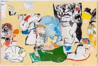 Martinez's work shifts between traditional and unconventional modes of abstract and figurative painting and drawing, reinterpreting the past (his own and that of art history) and blurring boundaries to push his practice in new directions.[24][21] His paintings are described as energetic, visceral and immediate, with bold line, coarse brushwork, and aggressive color and texture achieved through combinations of oil, enamel and spray paint, silkscreening, and collaged elements on canvas.[3][25][26] His drawing—key to his work and a significant inspiration for his painting—functions like a spontaneous, daily biographical-journalistic tool; critics describe it as looser and more unrehearsed and speculative than his paintings, comparing its simple style to that of Paul Klee.[27][28][29] Martinez prefers a rapid working process, with little pre-thought in order to maintain spontaneity; he likens it to the back-and-forth movement between action and pause, contact and regrouping in boxing.[8][12] In addition to painting and drawing, Martinez has produced large and small-scale abstract sculpture, made or developed from found objects and cast in bronze, which derive from his painting practice.[5][19]
