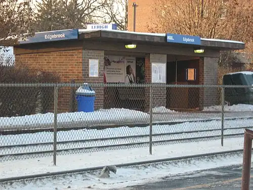Edgebrook is a commuter railroad station on Metra's Milwaukee District North Line in the Edgebrook neighborhood of the Forest Glen section of Chicago, Illinois. The station is 11.5 miles (18.5 km) away from Chicago Union Station, the southern terminus of the line,[3] and serves commuters between Union Station and Fox Lake, Illinois. In Metra's zone-based fare system, Edgebrook is in zone 2. As of 2018, Edgebrook is the 74th busiest of Metra's 236 non-downtown stations, with an average of 701 weekday boardings.[2] This is the last station outbound in Chicago city limits.