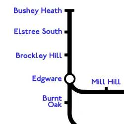 - The existing Underground line would be extended north-west from Edgware by 5 kilometres to a new terminus at Bushey Heath and a depot at Aldenham. The extension to Bushey Heath involved three new stations (from south-east to north-west):