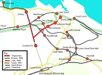 The North Bridge station was opened on 22 June 1846 by the North British Railway as the terminus for its line from Berwick-upon-Tweed. The Edinburgh and Glasgow Railway's General station opened on 17 May 1847, on the same day as the Canal Street station of the Edinburgh, Leith and Newhaven Railway, serving Leith and Granton via a long rope-hauled tunnel under the New Town. The collective name "Waverley", after the Waverley Novels by Sir Walter Scott, was used for the three from around 1854 when the through "Waverley" route to Carlisle opened. Canal Street station was also known as Edinburgh Princes Street,[1] not to be confused with the Caledonian Railway railway station later built at the West End which was named Princes Street station from 1870.
