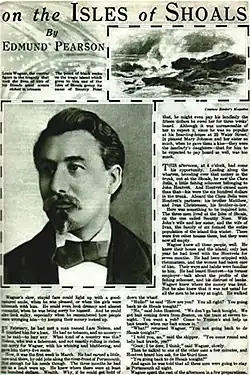 From 1909 to 1914, Pearson lived in Newburyport and wrote several books. He wrote stories based on his childhood in The Believing Years and The Voyage of the Hoppergrass. He published some of his columns from the Librarian in The Library and the Librarian, The Librarian at Play, and The Secret Book. During this time he also served on the board of trustees of the Newburyport Public Library. In 1914, Pearson and his wife moved to New York City and from 1914 to 1927 he worked at the New York Public Library as the Editor of Publications. Starting in 1914, Pearson wrote a series of columns about books for national periodicals such as The Nation (column name: Books and Men), The Dial, the Weekly Review (later called the Independent and Weekly Review) (column names: Books and the News, New Books and Old), and The Outlook (column name: The Book Table).[7] He also wrote book reviews for many publications including The Saturday Review of Literature. He wrote three books about books, Books in Black or Red, Queer Books, and Dime Novels.[3] His work of writing was interrupted briefly during the First World War when he was commissioned as a second lieutenant, but did not serve overseas.[8]