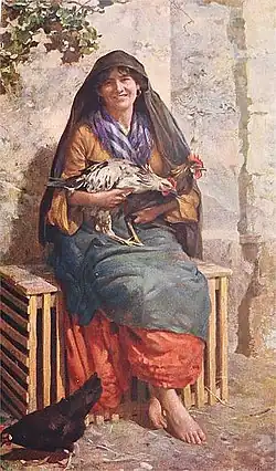 Caruana Dingli's work incorporates portrait paintings in oil where his main subjects were prominent Maltese figures such as politicians, clerics and prelates. On the other hand, Caruana Dingli also painted folkloristic watercolour and gouaches paintings depicting Maltese landscape, countrysides and local street scenes with merchant sellers, farmers and children playing traditional Maltese games.[2] Giuseppe Calì, who was Caruana Dingli's mentor and close friend, encouraged Caruana Dingli to focus his work on realism whilst holding a romantic idealism.[6]