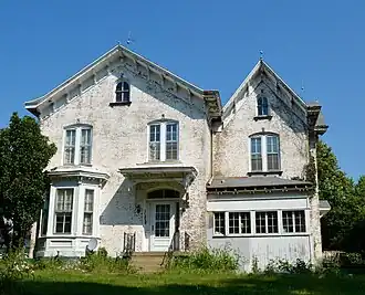 The Edward Hamer House is a historic house located at 200 West 2nd Street in Vermont, Illinois. Businessman Edward Hamer had the house built for himself and his wife in 1871. The house has an Italianate design and is one of two Italianate homes in Vermont with a front-facing gable. Both of the house's gables are steep and feature decorative brackets along the cornice. The front entrance is topped by a decorative hood with braces and paired brackets. A three-sided bay window with matching brackets projects from the first floor next to the entrance; the house's remaining windows are tall, narrow, and topped by segmental arches.[2]