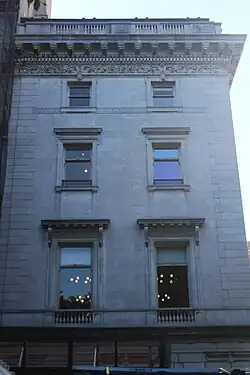 The second through fourth stories have a smooth ashlar facade with quoins at each corner. The second-story windows, which illuminate the reception rooms inside, are taller than those on the upper stories. There are balustrades at the bottom of each second-story window, as well as console brackets with cornices above each window.[1] In addition, the central second-story window on 75th Street has a small balcony directly above the entrance, and there are scrolls beside the window and a broken pediment above.[1][24] The third-story windows are plain in design; these windows have sills supported by corbel blocks, as well as plain cornices above. The central third-story window on 75th Street has a balcony with tracery on its balustrade.[1] The fourth-story windows are square, and the window sills are connected by a decorative frieze. The lintels above the fourth-story windows are connected by a frieze with foliate patterns in high relief.[1] A cornice with dentils runs horizontally above the fourth floor.[2] The attic level is concealed by the cornice and by a balustrade running above the fourth floor.[1]