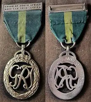 - ^ a b c Fforde, JPI; Monick, S (1986). A Guide to South African Orders, Decorations and Medals and their Ribbons 1896–1985. Johannesburg. p. 40.