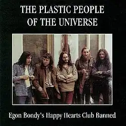 Egon Bondy's Happy Hearts Club Banned is an album by Czech underground band the Plastic People of the Universe.[1] It was recorded in 1974/75, mainly at Houska Castle, enabled by the castle's then warden Svatopluk Karásek, with some songs being recorded in Prague.[2] The album could not be officially released and distributed under the former Communist regime in Czechoslovakia; instead fans duplicated tapes with one another, often resulting in poor technical quality. After the band members' arrest and trial in 1976 Ivan Hartl, a Czech living in London, attempted to get the album released in the west.[3] It was released in 1978 in France by SCOPA Invisible Production and in England by Boží Mlýn, a label founded by the former Plastic People member Paul Wilson.[4][5] In the Czech Republic a remastered version was published in 2001 by Globus Music. The album title is a reference to the Beatles' album Sgt. Pepper's Lonely Hearts Club Band. Ivan Hartl supplied the pun on "banned/band".[3] Most of the songs on the record are settings of poems by Egon Bondy.[6]