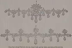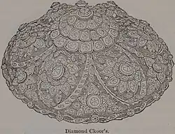 The kurs are round convex jewelry items, about 5 inches in diameter, sewn to the top of a ladies tarboosh. It was generally worn by upper and middle-class women, but sometimes lower-class women had a gold kurs. The diamond kurs was made of diamonds set in gold, or less commonly silver. It was quite heavy. The gold kurs was a plate of thin embossed gold. It had an emerald or green glass cabochon set in the center. The kurs and kussah worn on the outside of the red bridal shawl, and decorated the bier of a woman.[33] A similar piece called a tepelikler[34] or tepelik is also traditionally worn in Anatolia.[35]