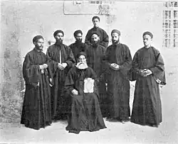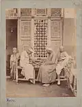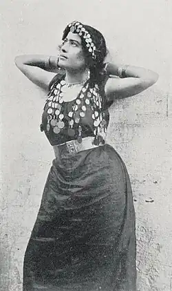 The common hairstyle of 19th-century women was made of an odd number of tiny braids, somewhere between 11 and 21. The hair around the forehead and temples was usually left loose, and sometimes curled. It was sometimes also braided.[26] Three silk cords per braid were braided in, with gold bark attached along their length. These cords were called ṣafa. Pendants, coins, tassels of pearls, and emerald or coral beads would be attached to the ends of the cords. The braids of cord were also sometimes attached to a silk band and tied around the head to form a braided wig.[33] This hairstyle was initially associated with higher class women, but persisted longer among lower classes, dancers, and Beoduin women. Lower-class women wore a similar hairstyle of two braids with red silk cord mixed in.[30] This style was called 'okoos, and the long cords ended with tassels.[33]
