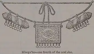 Amulets which are, or are made to look like, containers are also popular, taking the form of small boxes or cylinders, and often called hegab. These made be made of leather or metal and may contain slips of paper with protective formulas written on them, though the metal ones are usually empty. They often have small bells called galagil attached. They may be worn on necklaces,[42] tucked under the arm (with the cord crossing over the left shoulder and the case hanging under the right arm by the hip),[33] or suspended from the head. In Lower Egypt they are often decorated with floral patterns and vertically divided galagil. In Upper Egypt, the patterns are usually geometric with horizontal galagil.[42] Religious inscriptions were also sometimes used on the case itself.[33] Sometimes these were also made with glass beads, with cowrie shells substituted for galagil.[41]