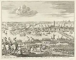 A Spanish strike into Holland was attempted in April 1599 – Francisco de Mendoza, the Admiral of Aragon was ordered by the Archduke of Austria to mount an offensive into the Bommelerwaard. Once this had been taken, the Spanish would then be able to cut Holland off and gain more favourable talks in the peace process. The offensive, however, went awry from the start. Mendoza, with 12,000 soldiers on horseback or foot, tried to go through to Zaltbommel by taking Schenkenschanz on 28 April, but was repelled by the small English garrison.[7] The Spanish moved around the fort however and took Fort Crevecour and constructed Fort Sint-Andries near Heerewaarden. A siege of the town of Zaltbommel by Spanish troops was attempted, but was lifted by the approaching Anglo-Dutch force of 10,000 infantry and 3,000 cavalry led by Maurice of Nassau. The Spanish were defeated in the Siege of Zaltbommel (15 May – 22 July 1599) and subsequent attempts to regain the initiative. Mendoza retreated and the Spanish army then found itself in chaos: mutinies, desertions and sickness took effect.[8]