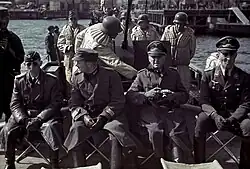 German Luftwaffe officers and Finnish Eversti Bror Kraemer are on board an infantry boat (I-boat) during the Axis naval review at Lakhdenpokhya on Lake Ladoga, 13 August 1942; this I-boat was armed with a 2 cm Flak 38 in addition to 7.92 mm machine guns
