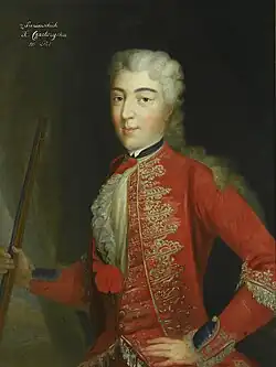 Through her extensive contacts from Neuburg court, through Prague, Vienna and Wrocław, the hetmaness brought to Poland many renowned artists. Ádám Mányoki, Rákóczi's court painter, before he was appointed official court painter of Augustus II was at Sieniawska's service in Warsaw since 1713.[12] She employed the most prominent artists active in the Commonwealth. Among them there were architects Giovanni Spazzio, Józef Fontana, Karol Bay, Efraim Szreger and František Mayer of Moravia, painters Jan Jerzy Plersch and Giuseppe Rossi, eminent sculptors of Bohemian Baroque Jan Elijáš and Hynek Hoffmanns,[33] stucco decorators Francesco Fumo and Pietro Innocente Comparetti, gardener Georg Zeidler of Saxony.[34] She also employed Dresden court artists such as Johann Sigmund Deybel, Louis de Silvestre and sculptor Jean-Joseph Vinache[35] and was a patron of young talented artists, like Julius Perty son of her architect Jacob, who was trained in Charles de Prevot's atelier in Sandomierz between 1726 and 1730.[36] Among her protegees was also a poet Elżbieta Drużbacka known as the Sarmatian Muse.[37]