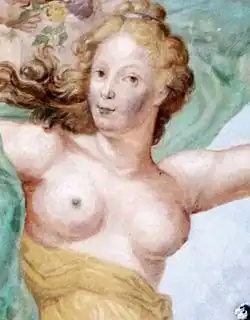 The conservation and enlargement of the former residence of Victorious King, John III Sobieski, is considered as her most significant achievement in the field of architecture. She embellished the palace facades and garden parterres with her coat of arms Szreniawa and monograms.[29] For the decoration of the palace's interiors she nominated an Italian fresco painter Giuseppe Rossi, who adorned the chambers with trompe-l'œil paintings and mythological plafonds. By taking the example of Queen Marie Casimire, that ordered to paint her as a goddess in palace plafonds, the hetmaness decorated the Lower Vestibule with a fresco depicting her as a Roman goddess of fertilityFlora (she was almost 60 at that time).[41]