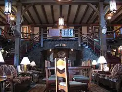 El Rancho Hotel, Gallup, New Mexico, is a historic hotel built by R.E. “Griff” Griffith,[2] the brother of film director D.W. Griffith. The pair encouraged early film production in the surrounding area.[2] It is located on old U.S. Route 66 and became the temporary home for many Hollywood movie stars. The rambling, three-story hotel building has a large portico with a central balcony reminiscent of the Southern Plantation style. The National Park Service describes it as having a “rusticated fantasy appearance.” Materials include brick, random ashlar stone, and rough-hewn wood with a wood shake roof and brick and stone chimneys. The lobby features a spectacular walk-in fireplace made of brick and random ashlar stone surrounded by twin stairways made of split logs that lead to the second floor guest rooms.[2] The slogan “Charm of Yesterday, Convenience of Tomorrow” is rendered in neon above the main entrance.[3]
