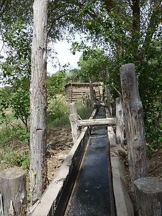 LA CANOA ELEVADA- Trough of hollowed log, elevated on log structure. - La Cienega Acequia, Truchas Molino, formerly adjacent to El Rancho de las Golondrinas