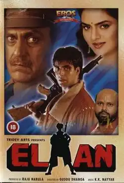 Elaan is a 1994 Indian Hindi-language action film directed by Guddu Dhanoa.[3] It stars Akshay Kumar, Madhoo, and Amrish Puri in pivotal roles.[4] Other cast members include Farida Jalal, Deven Verma, Mohnish Behl, Dalip Tahil, Mohan Joshi, and Rami Reddy.[5] Released on 21 January 1994, the film was a commercial blockbuster.[2]