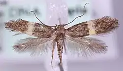 The wingspan is 9–10 millimetres (0.35–0.39 in). The head is blackish-grey. Forewings are blackish; a straight somewhat inwardly oblique central whitish-yellowish fascia, in male narrowed towards costa; tips of apical cilia whitish. Hindwings are dark grey. The larva is grey-green, yellowish-tinged; head yellow-brown; 2 with two pale brown spots.[2][3] [4]