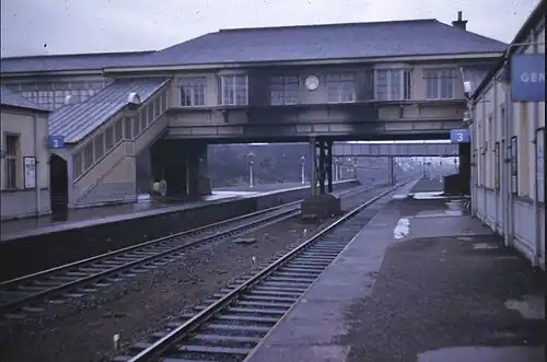 Elderslie station closed on 14 February 1966 and was demolished shortly after,[1] however it remained a junction until the closure of the Paisley Canal Line through to Kilmacolm in 1983. Following the Ayrshire Coast Line electrification in 1986, an Up Passenger Loop remains, and the line to the south west is signalled for bi-directional working. All that remains of the station now is the bricked off entrance on the main road, which once led to the covered walkway, and a large brick abutment adjacent to the current Glasgow to Ayr line.[3]