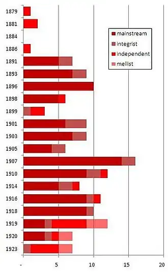 The Nocedalista breakup triggered a more aggressive electoral policy, as both the Integrists and the mainstream Carlists tried to outpace each other.[40] The year of 1891 marked their first official campaign.[41] Demonstrating mutual and bitter hostility,[42] both groups considered traditional Carlist enemies lesser evil; Carlos VII and Ramón Nocedal alike instructed their followers to seek alliance even with the Liberals if that was to produce defeat of their ex-fellow brethren.[43] This approach started to change locally in the final years of the 19th century,[44] in the 20th century both groups driven together by a joint opposition to new governmental laws.[45] Nevertheless, between 1891 and 1907 both branches combined failed to gather more than 10 MPs in one term,[46] the mainstream Carlism holding on aggregate 44 mandates and Integrism winning 12[47]