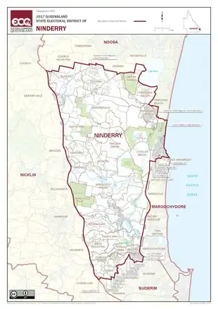 Located in the Sunshine Coast, Ninderry consists of the suburbs of Eumundi, Doonan, Weyba Downs, Peregian Beach, Peregian Springs, Verrierdale, North Arm, Ninderry, Valdora, Yandina, Yandina Creek, Coolum Beach, Maroochy River, Parklands, Bli Bli, Rosemount, Diddillibah, Kiels Mountain, Kunda Park, Kuluin, Forest Glen, Mons and "North Buderim".[1]