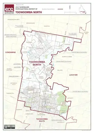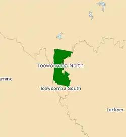 Toowoomba North is an electoral district of the Legislative Assembly in the Australian state of Queensland. It was created with the 1972 redistribution. It replaced the abolished electorate of Toowoomba West. Toowoomba North is largely based around the upper half of the city of Toowoomba.[1]