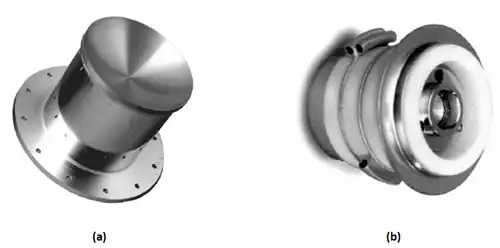 Here, η is the electron gun assembly (EGA) efficiency (~0.97 in TSS-1), ρ is the perveance of the EGA (7.2 micropervs in TSS-1), ΔVtc is the voltage across the accelerating grid of the EGA, and It is the emitted current.[40] The perveance defines the space charge limited current that can be emitted from a device. The figure below displays commercial examples of thermionic emitters and electron guns produced at Heatwave Labs Inc.