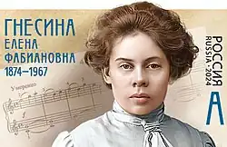 Elena Fabianovna Gnesina ⓘ (sometimes transcribed Gnessina) (Russian Елена Фабиановна Гнесина) (30 May 1874 – 4 June 1967) was a Soviet and Russian composer and music educator, a sister of the composer Mikhail Gnesin.