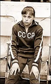 Elena Vyacheslavovna Mukhina (Russian: Елена Вячеславовна Мухина; first name sometimes rendered "Yelena", last name sometimes rendered "Muchina"; 1 June 1960 – 22 December 2006) was a Soviet gymnast who won the all-around title at the 1978 World Championships in Strasbourg, France. Her career was on the rise, and she was widely touted as the next great gymnastics star until 1979, when she broke a leg and missed several competitions. The rushed recovery from that injury, combined with pressure to master a dangerous and difficult tumbling move (the Thomas salto) caused her to break her neck two weeks before the opening of the 1980 Summer Olympics, leaving her permanently quadriplegic.