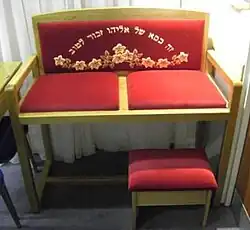 "Chair of Elijah" used during the brit milah (circumcision) ceremony. The Hebrew inscription reads "This is the chair of Elijah, remembered for Good."