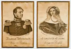 On 29 November 1823, she married the future King Frederick William IV of Prussia[3] and supported his intellectual interests, namely his attempts at artwork, which he held dear to his heart. She refused to become a Protestant as a condition of her marriage, to ascend the throne of Prussia next to the future king, insisting that she would only convert if she was convinced on the merits of the reformed faith after studying it for herself.[4] It was on 5 May 1830, seven years after her marriage, that Elisabeth formally converted to Protestantism.[5] Her union was reportedly happy, but remained childless: after a single miscarriage in 1828, Elisabeth was unable to have any offspring.[6]