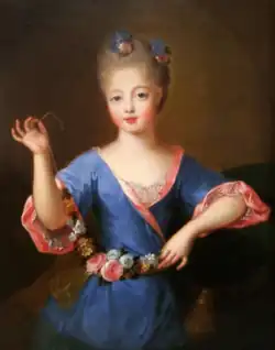 In the spring of 1725, the young French king, Louis XV, was fifteen and unmarried. He was engaged to Mariana Victoria of Spain, but the young princess was sent back to Spain because she was too young to conceive. As a result, Élisabeth Charlotte began negotiations to marry Elisabeth Therese to the king.[1] However, this was met with opposition from the king's prime minister, the Duke of Bourbon, who arranged for the king to marry an obscure Polish princess Marie Leszczyńska whom Louis XV quickly fell in love with later that year. The Duke of Bourbon stated that marriages between kings of France and princesses of Lorraine always resulted in strife, and that the House of Lorraine was too closely related to the House of Habsburg, which would cause discontent and conflict within the French nobility.[2]