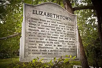 The town was platted in the early 1800s by Joseph Wilson and named in honor of his daughter, Elizabeth Wilson.[2] The town's central economic activity was centered on a flour mill and a saw mill.[3] The town's inhabitants had hoped for the village to become the county seat of either Blackford or Delaware County. Blackford County chose Hartford City and Delaware county chose Muncie. The town slowly declined in the middle of the 19th century and ceased to exist at the beginning of the 20th.[4] The only existing remnant of the town is the adjacent Elizabethtown Cemetery.[5]