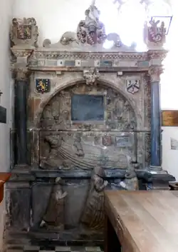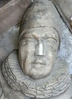 He died in 1635 and was buried in St. Andrew's Chapel (the "Cannons' Vestry") in Exeter Cathedral, as was also his wife when she died on 20 June 1636.[22] His elaborate monument with semi-recumbent alabaster effigy survives on the south side of the chancel in Bovey Tracey Church, opposite that of Nicholas Eveleigh, his second wife's first husband.