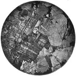 Photomicrograph of Ellicott City Granodiorite under crossed polarized light. Field represents approximately 0.85 cm.