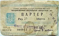 Demand for the eight concerts was high, with ticket prices set at 8 roubles, which was about the average daily wage in the Soviet Union. Over 90 per cent of the tickets were taken by senior Party members, diplomats and military officers. The remainder were changing hands on the black market for up to 25 times the official price.[12] As with other Western artists, John's music was only available in the USSR via illegal import. At the time, his records cost about $70 each on the black market.[4]