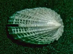 The size of the white shell varies between 7 mm and 15 mm. The shell has an oval-elongate contour and moderately elevated profile. The apex is close to the posterior margin, moderately coiled and not overhanging. The sculpture of the shell shows high, strong radial costae, some smaller radial costae intercalated on the sides, and comarginal lamellae forming a very coarse lattice with the costae. The slit in the shell is broad and rectangular, extending over 1/5 of the distance to apex.[2]