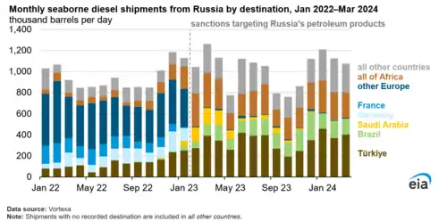 30. ^ a b c d e f g h i "The number of violations of the EU-G7 embargo on seaborne imports of Russian petroleum products from the Black Sea in April-May 2023 increased significantly". 26 June 2023.